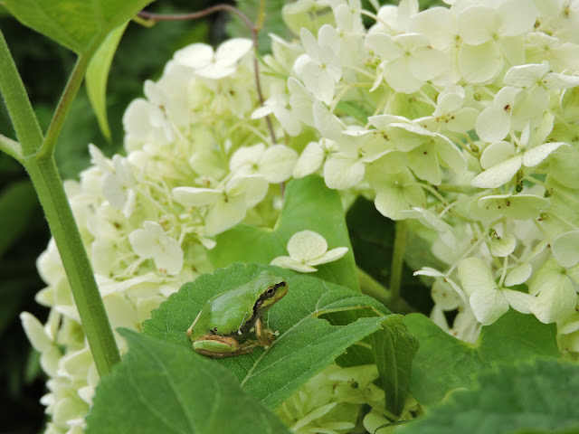 The tree frog suited well on a hydrangea leave. He seemed to enjoy seeing beautiful flowers around him.